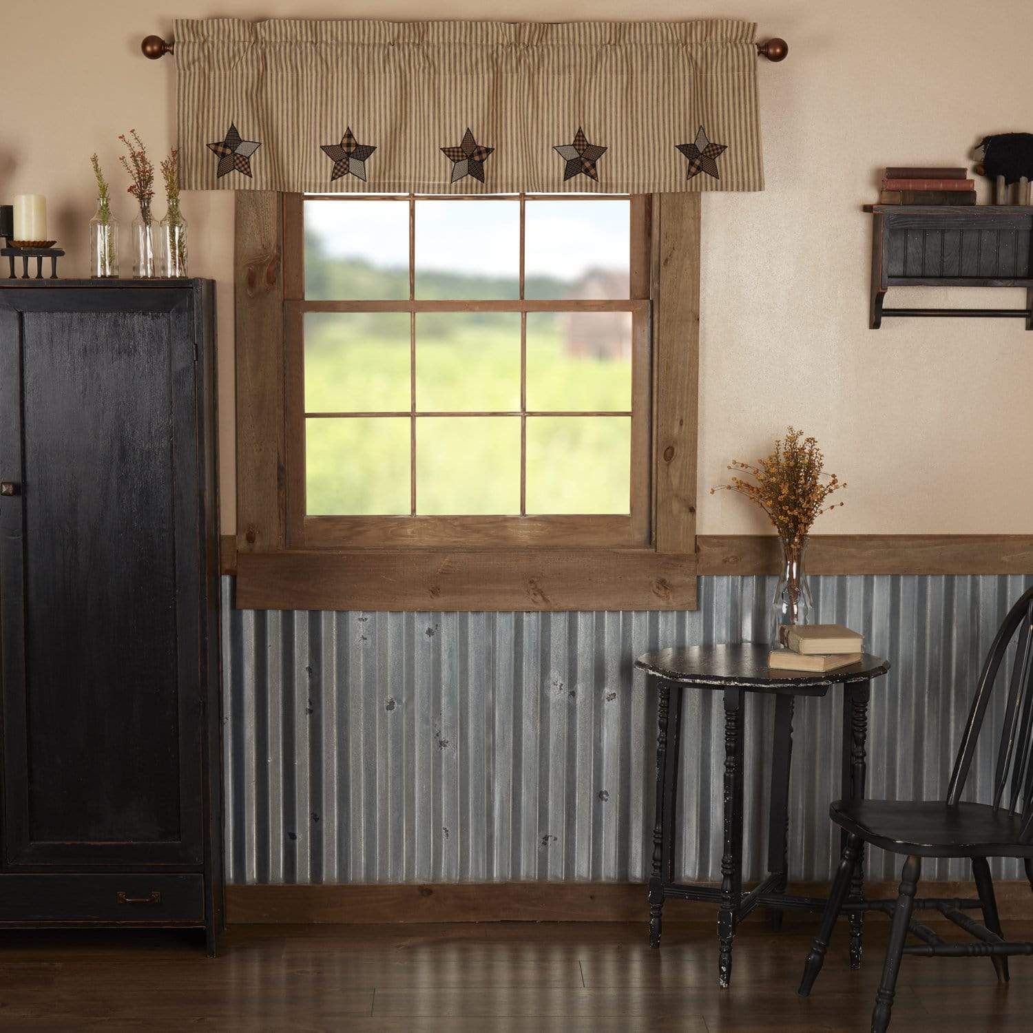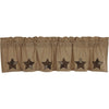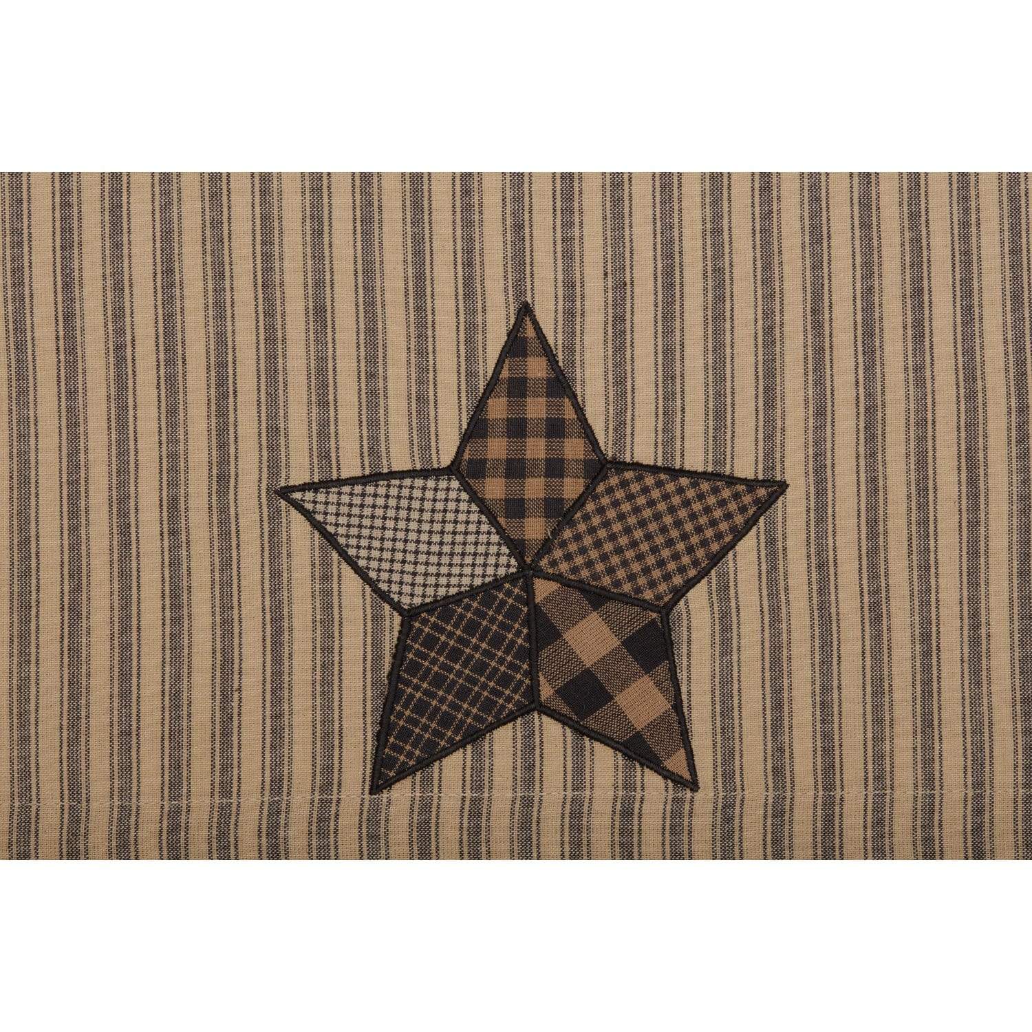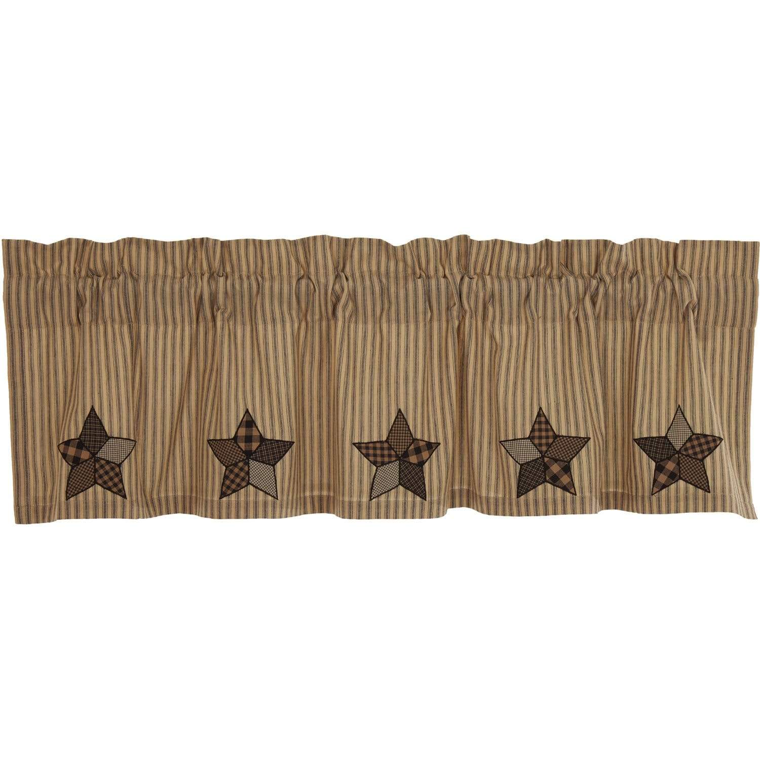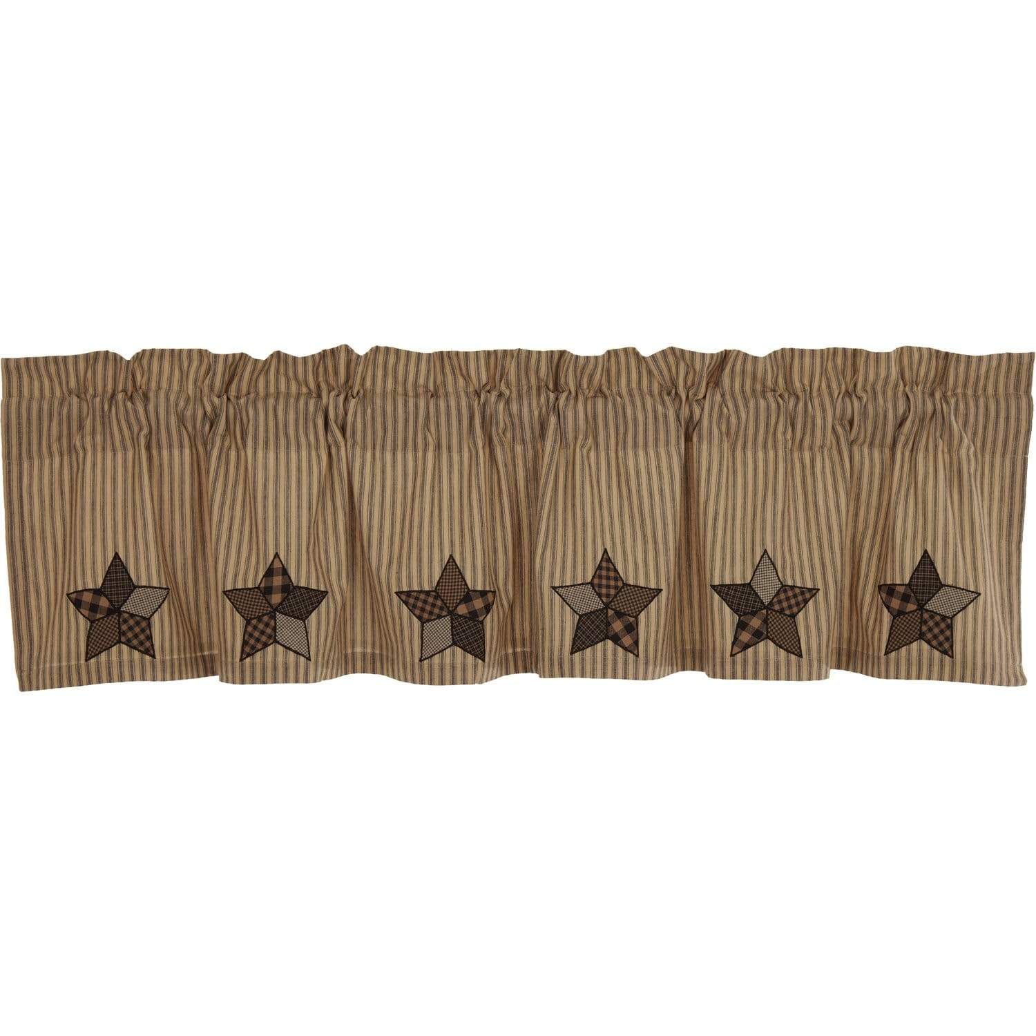 The 60 inch wide Farmhouse Star Applique Valance features large 5 point stars in black/khaki check patches of multi-sized checks and plaid. A base fabric of ticking stripe adds laid back classic country appeal. This valance is perfect for Americana or colonial themed kitchens with neutral or dark colors. 100% cotton. Features a rod pocket for easy set up.