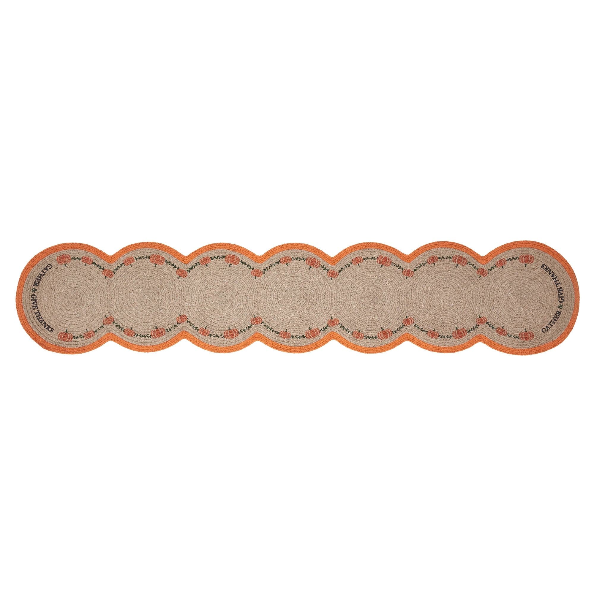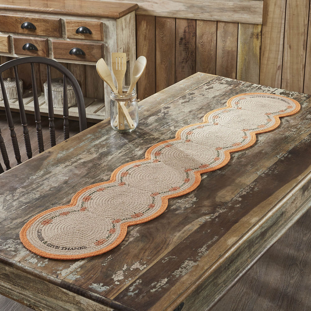 - Crafted from braided cotton with a touch of cotton-polyester blend, this oval-shaped table runner measures 12x60 inches, making it a charming addition to your kitchen and dining table decor for the fall and Thanksgiving season.