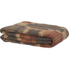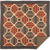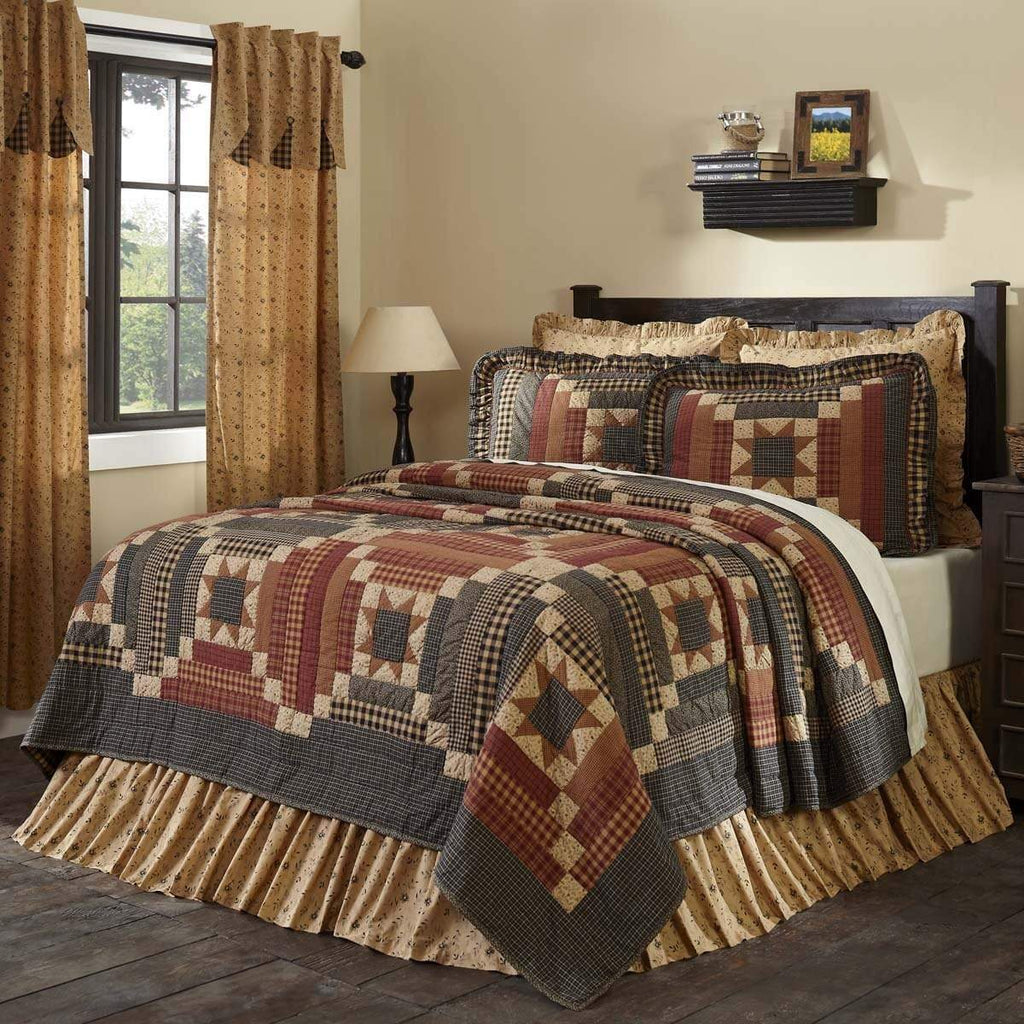 The Maisie Queen Quilt features 8 point stars set in tan Irish chains of ditsy floral prints. Stout courthouse step blocks of country black and burgundy balance dainty floral patterns to create a look with wide appeal. courthouse step blocks are arranged to create lines of black and burgundy. Hand quilted, 100% cotton, reverses to black and tan check found on front.
