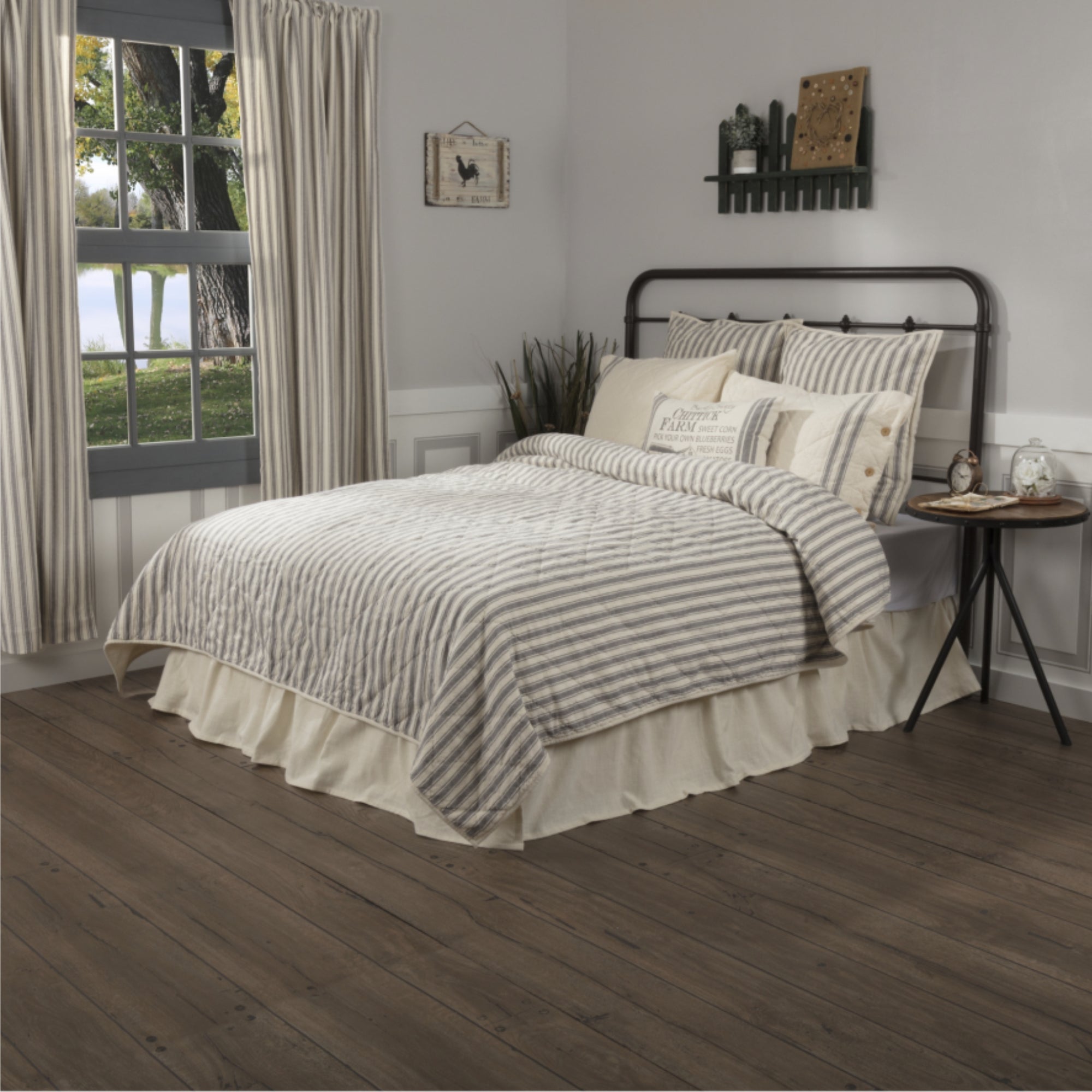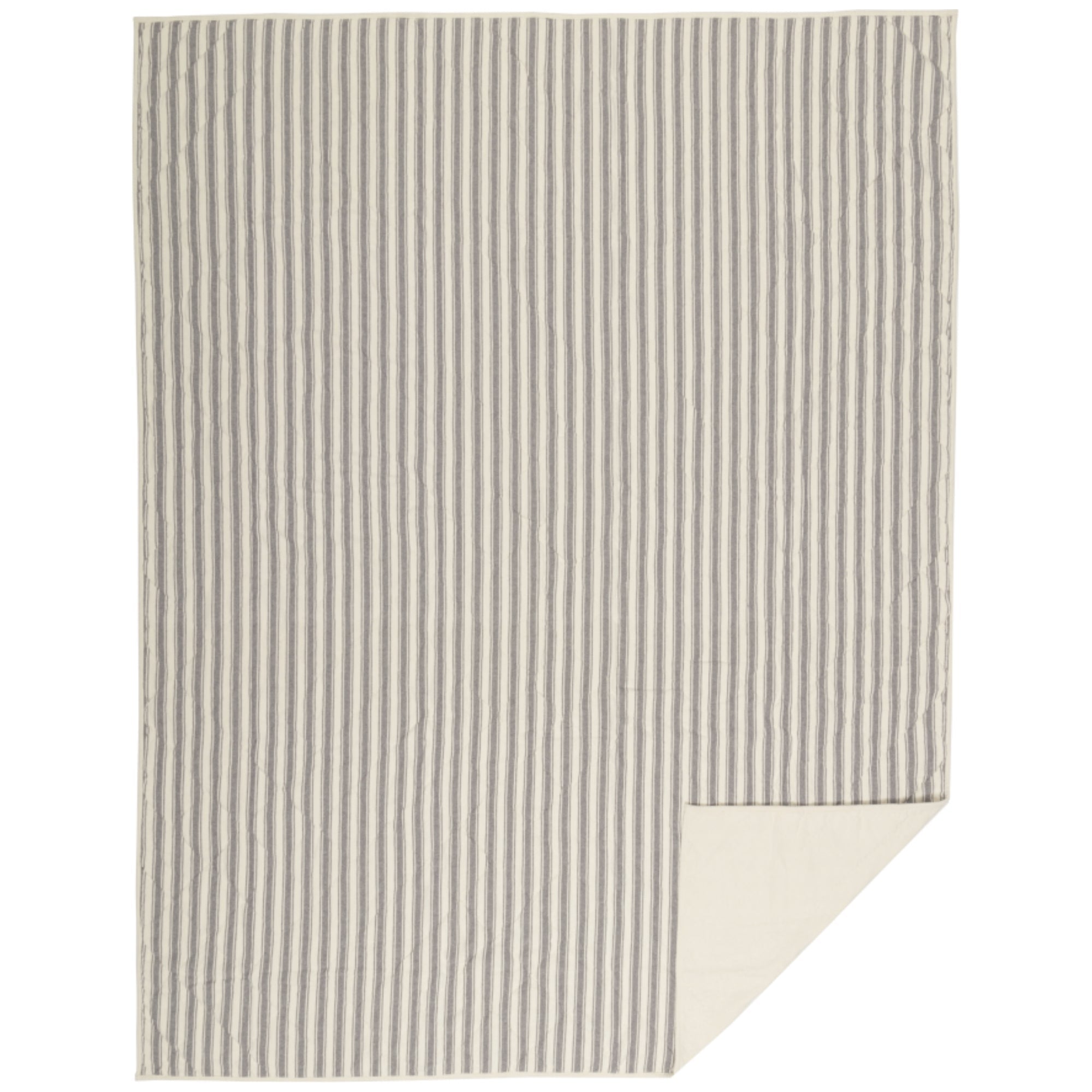 - On-point block hand-quilting on textured charcoal grey ticking stripe fabric; Charcoal grey ticking stripe is woven into classic creme base; Straight edge with .5 solid creme woven cotton fabric; Reverses to solid creme woven cotton fabric; Assorted fabrics: Hand-quilted, Machine stitched