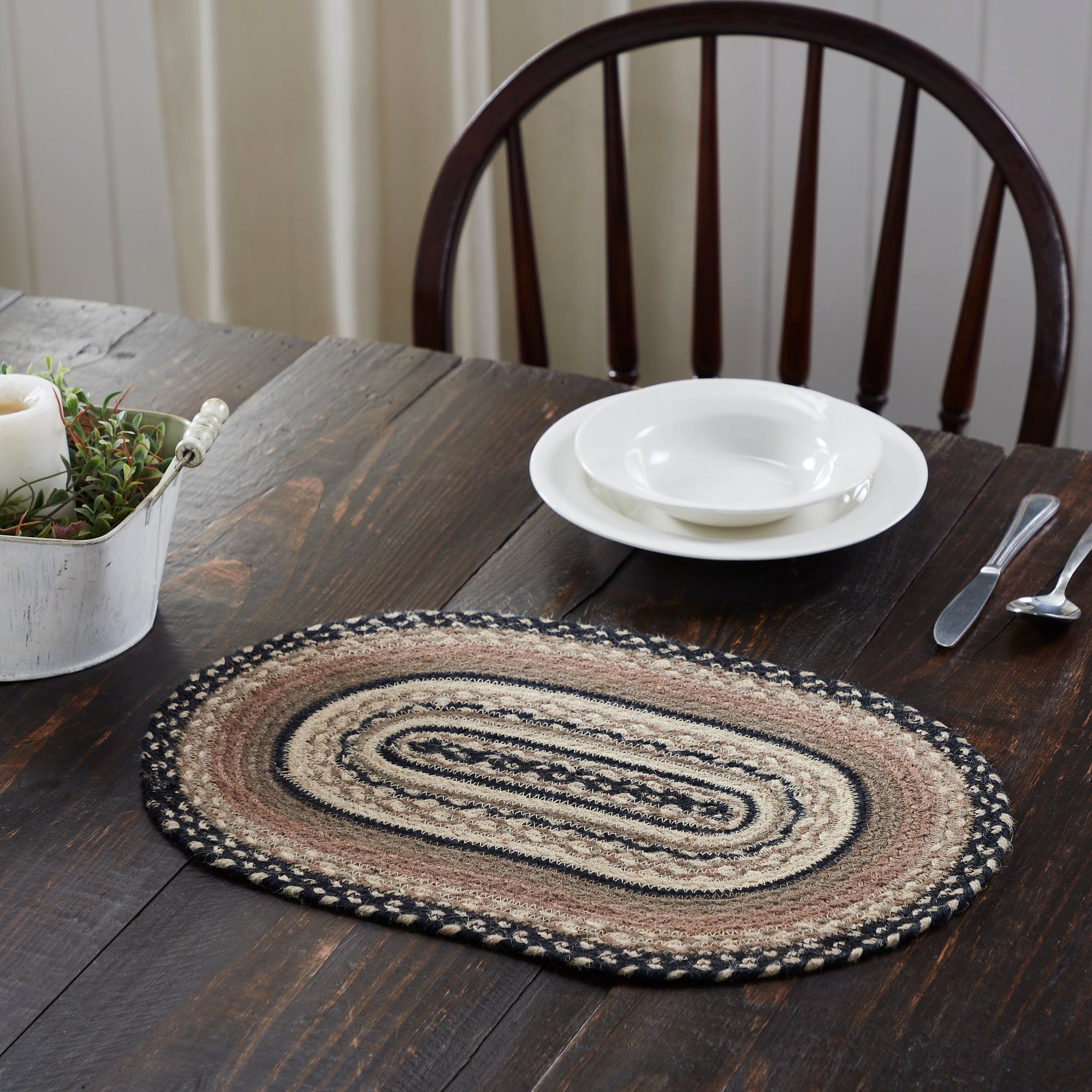 This Sawyer Mill Charcoal Creme Jute Oval Placemat adds a classic farmhouse touch to your decor. Rich colors of khaki, charcoal and dark creme add a rustic element to offset your decor. This 12x18 oval placemat is perfect for protecting your tabletop surfaces from heat, scuffs, or condensation. Made with 80% jute and 20% other materials for a closer, tighter weave.