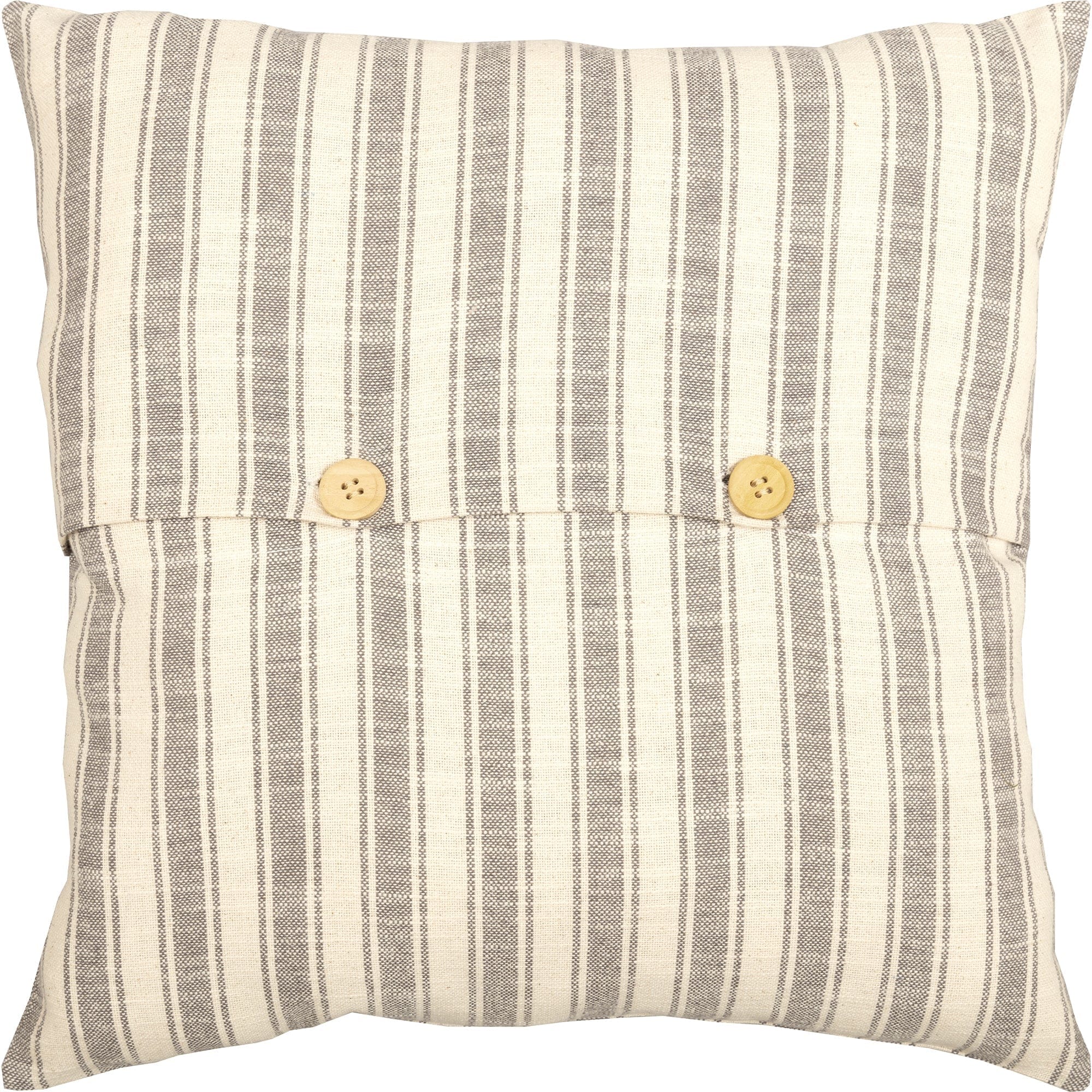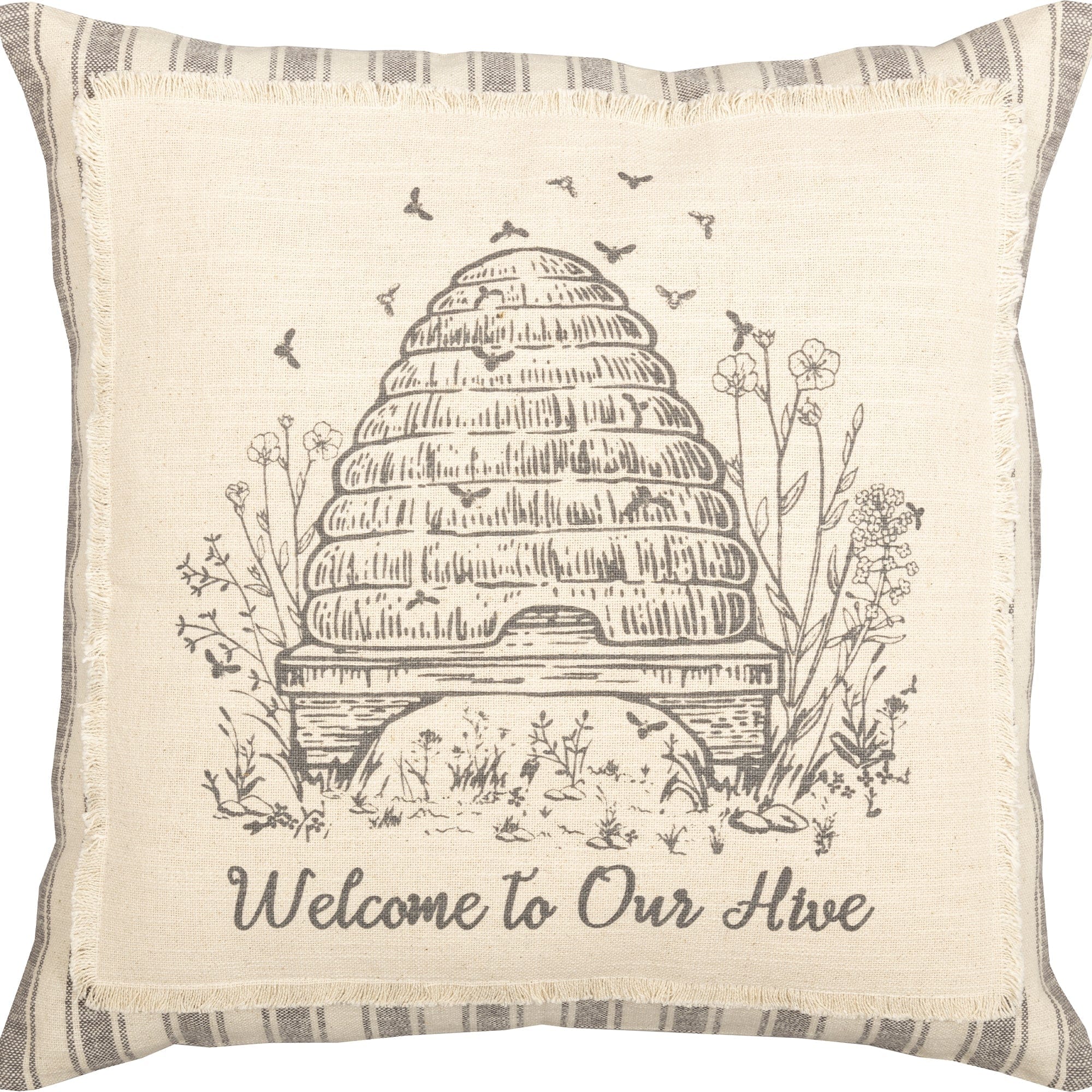 - A Honey Bee Hive in a natural with bees & flowers and Welcome to our Hive script word design is printed on cream fabric and appliqued as a patch on gray and cream ticking fabric. The patch features a frayed edge. Reverses to gray and cream ticking stripe fabric with two wooden buttons to keep the pillow secured within the cover.